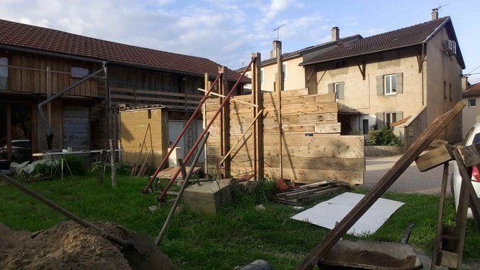 Un petit mur en pisé a été construit pour marquer une limite entre parking de la copro voisine et la terrasse de la maison, un autre du même gabarit est prévu pour prolonger cette délimitation, et être visible depuis la grande rue de Pont de Veyle !