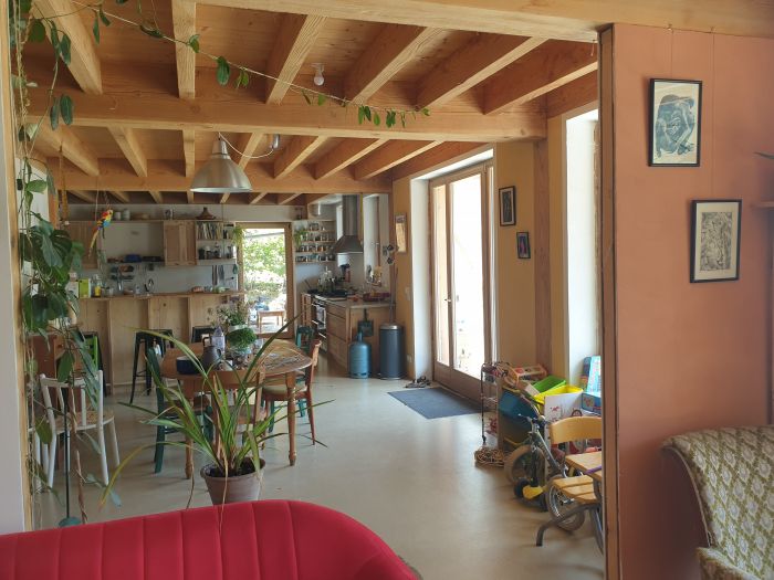 Pour la construction, que du bon !! Conception collective et bioclimatique, fondations périphériques en béton (presque que du bon ^^), dalle chaux/billes d’argiles, ossature bois massif d’un scieur local, isolation bottes de pailles et un peu de laine de bois en pignons, enduits chaux extérieurs et terre intérieurs, insufflation de ouate en toiture, bac acier, panneaux solaires thermique (de réemploi) et un peu de photovoltaïque, wc sec, récupération d’eau de pluie pour machines à laver en étude, ventilation double flux, fenêtres de réemploi pour la moitiés d’entre elles (17 sur 31), planchers chauffants, chape anhydrite lissée en finition sols, etc, etc, ….. !!
