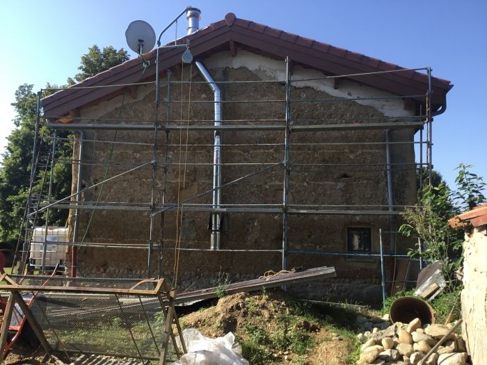 Le terre/paille jouera deux rôles : aplanir au maximum les trous et les bosses de la façade pour recevoir ensuite un enduit de finition à la chaux et jouer un rôle de correcteur thermique.