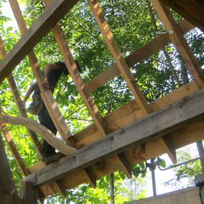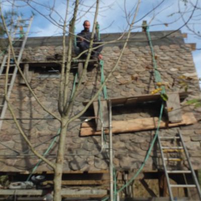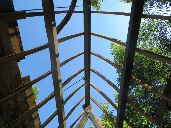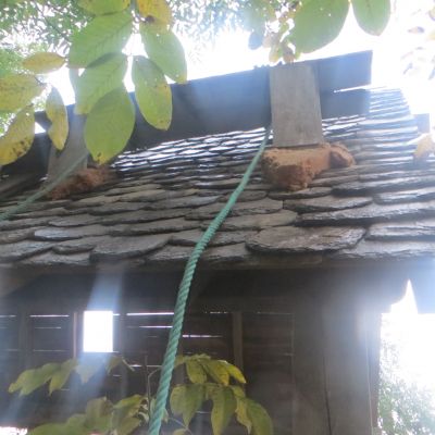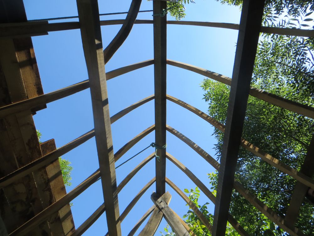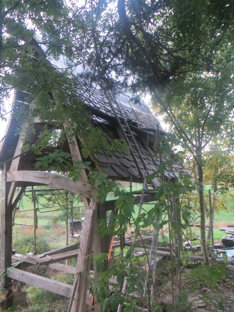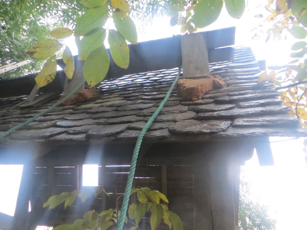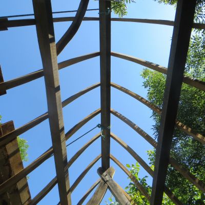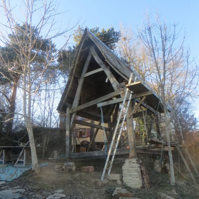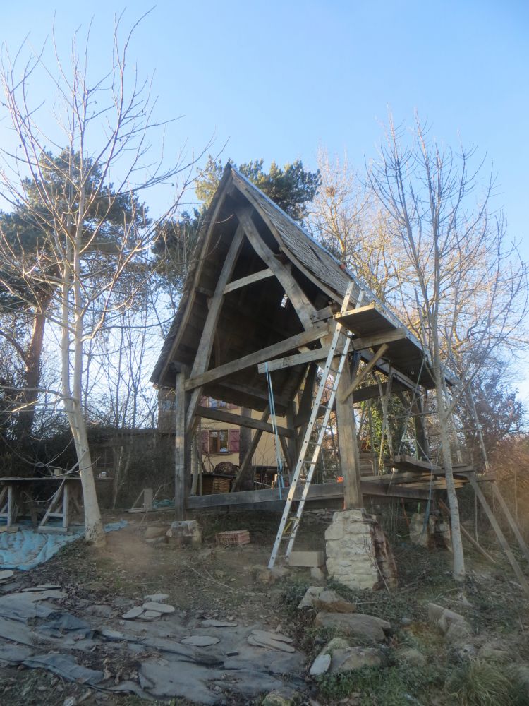 Actuellement, la structure de la cabane est levée et l’objet du chantier sera de réaliser la couverture des chevrons jusqu’au lauzes en passant par la volige.