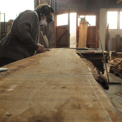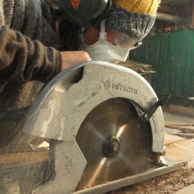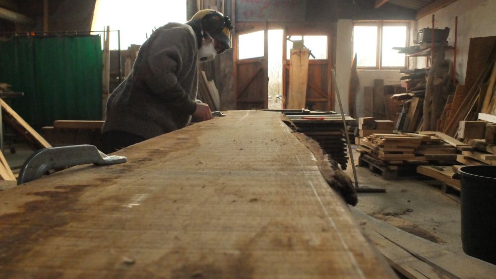 En cours: découpe des chevrons courbes à la scie à ruban
