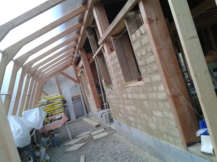 Un grand bâtiment est en cours de construction. Structure et charpente traditionnelle en bois, mur en paille et brique de terre crue, finition chaux/terre, terre et bardage bois.