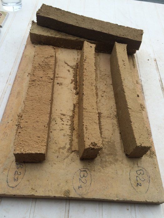 - Production par moulage des différentes formulations reparties sur 700 briques en terre crue (séchage naturel).