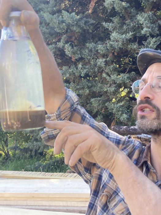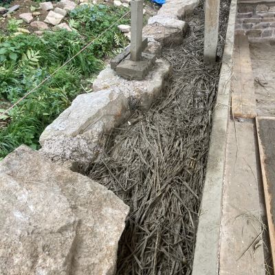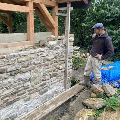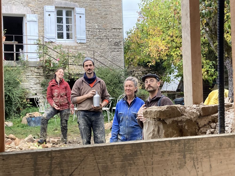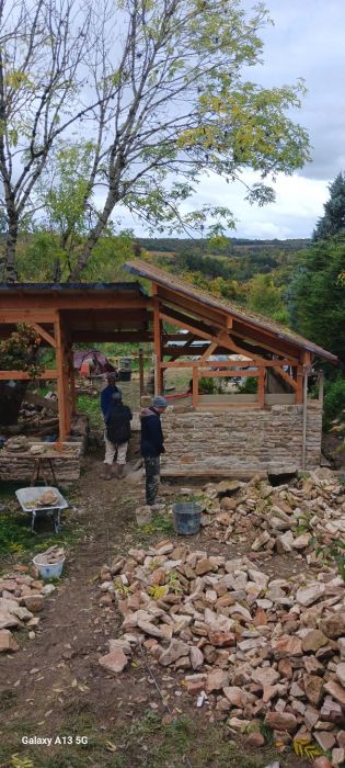 Un professionnel terre-paille-chaux m'accompagne: Gauthier. Il a à cœur de partager et promouvoir ces techniques, et est qualifié pour encadrer ce type de chantier: alternance du montage des murs chaux-pierre et du banchage terre-paille pour monter progressivement. Le chantier permet de comprendre la technique de construction par soubassement en pierre et mortier à la chaux.