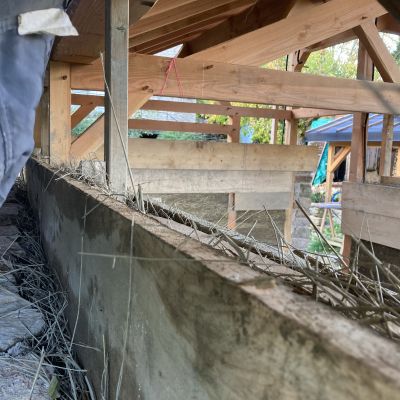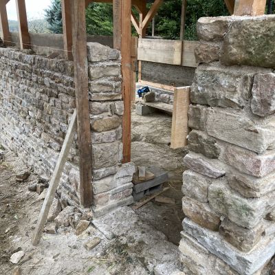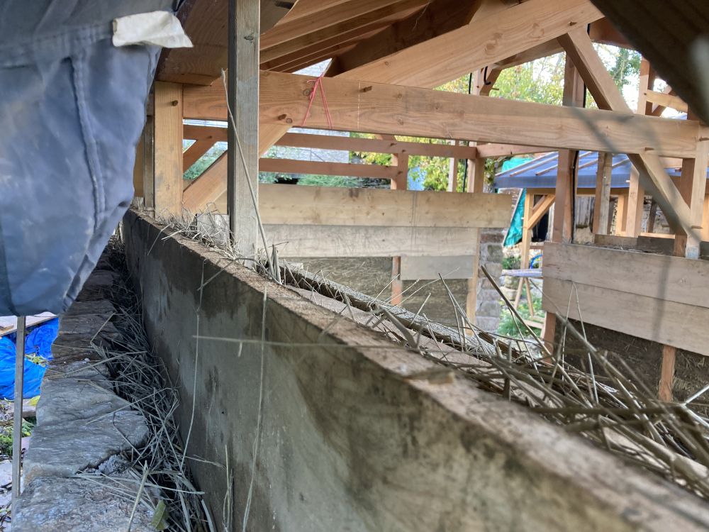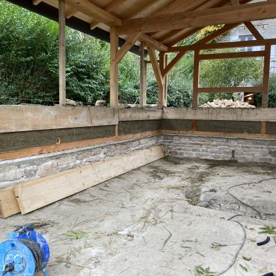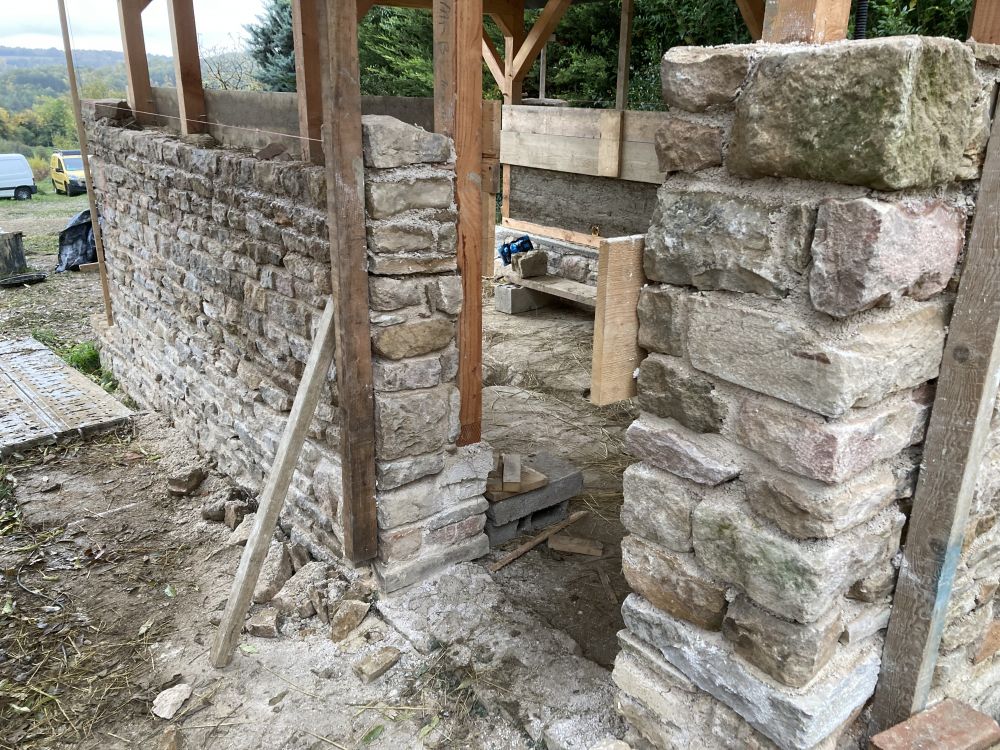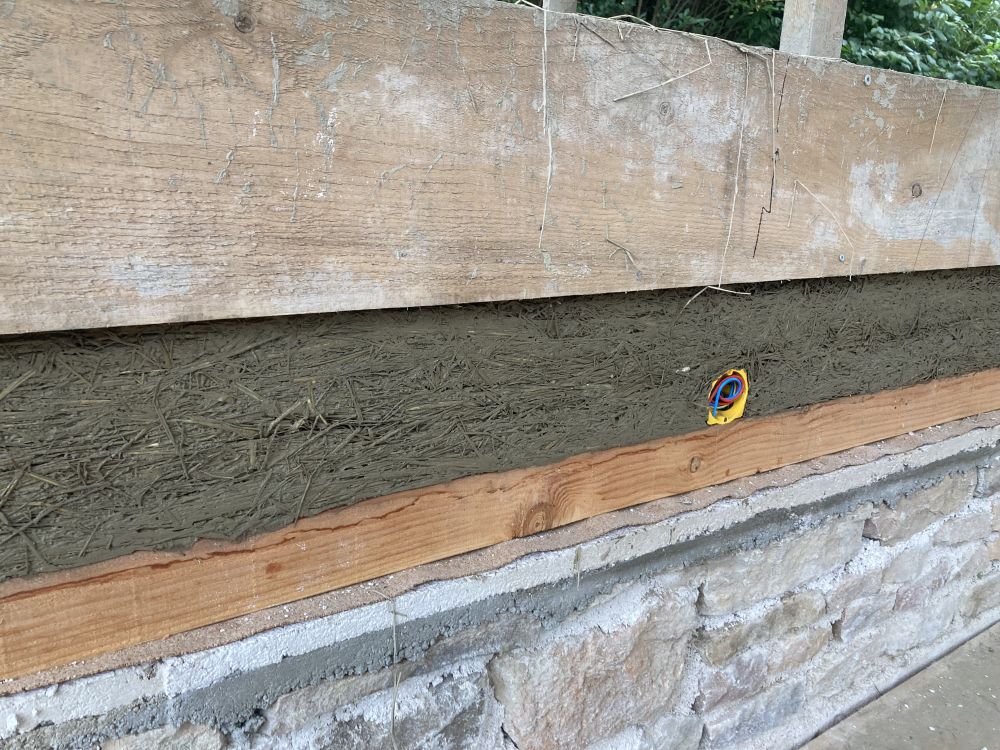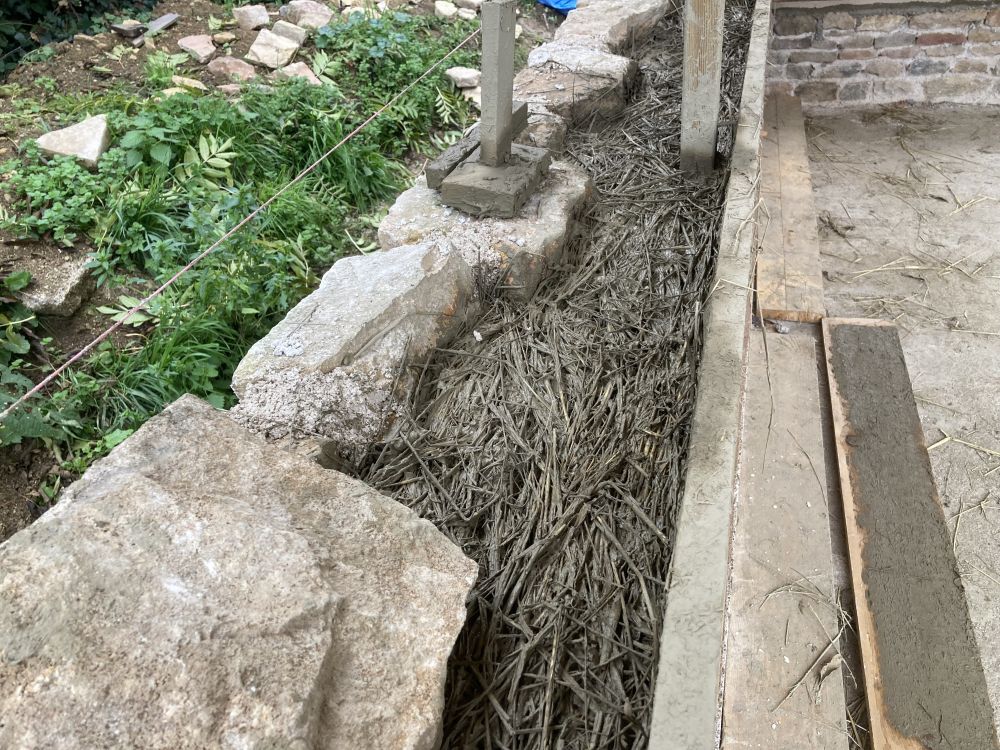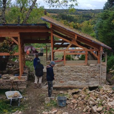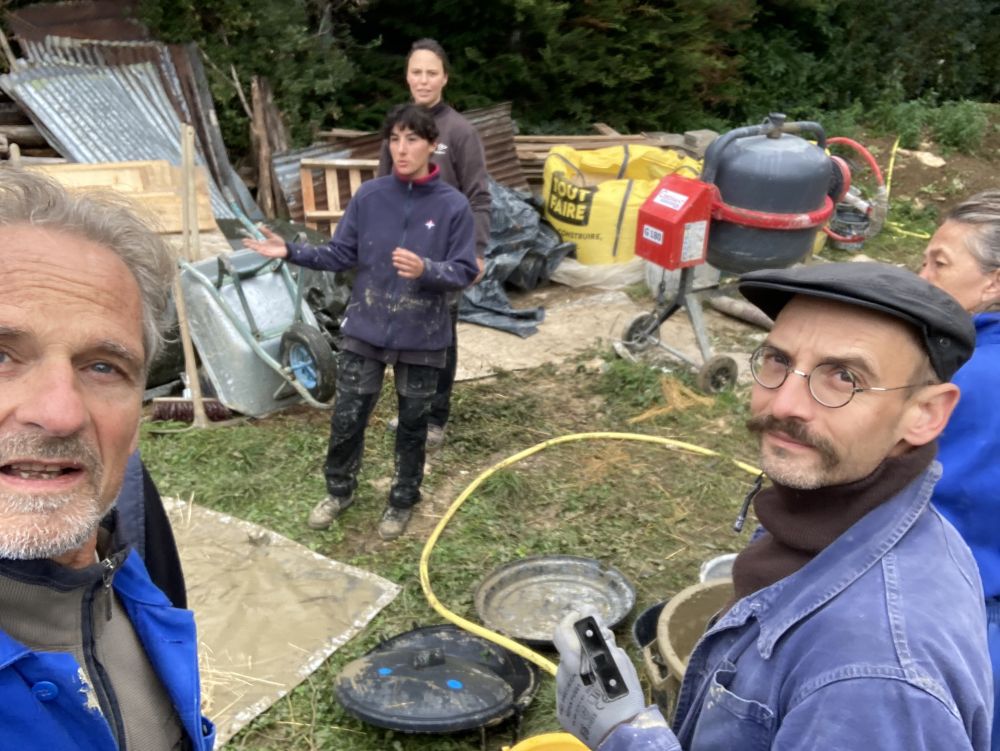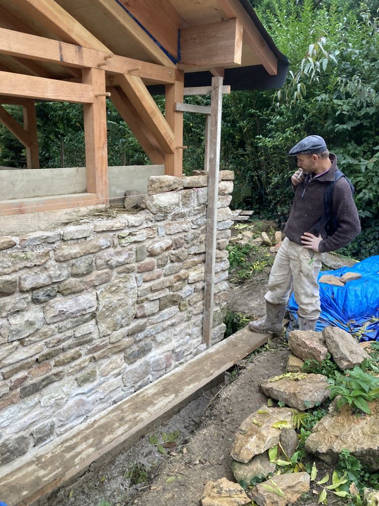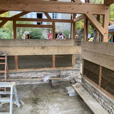 D'ci fin août le compagnon charpentier préparera la structure bois porteuse. Le but sera de monter les murs entre les poteaux de la structure, par niveaux, en élevant d’abord l'extérieur en pierres , puis le remplissage intérieur terre-paille. L’objectif quotidien sera fixé par Gauthier le spécialiste en fonction des personnes, de la météo, de l’avancement.