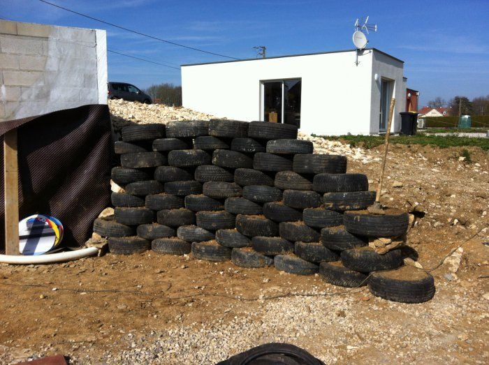 On a déjà les matières premières : pneus, fil type corde à linge pour lier les pneus, terre du terrain, toile de paillage... les plantations seront réalisées après la fin du chantier maison, histoire de pas les abimer pendant le chantier !