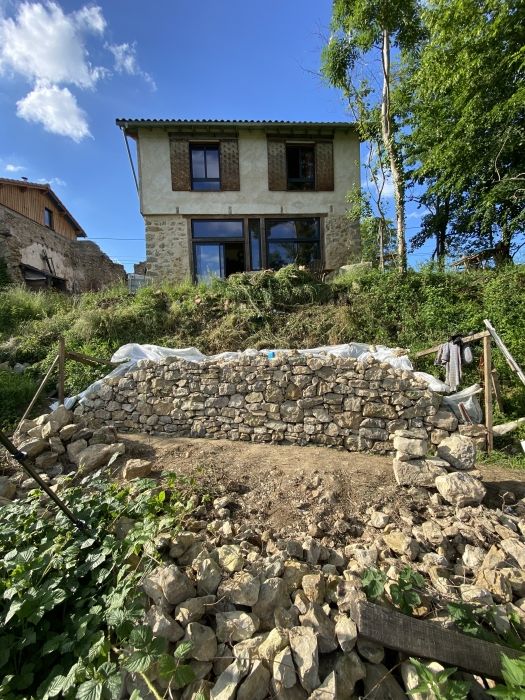 Le rdc forme une ceinture en pierre, dès que les arases seront finies et que le plancher du 1er étage sera posé, des murs en ossatures bois viendront accueillir les bottes de pailles, se suit la charpente, couverture, l'isolation, etc.