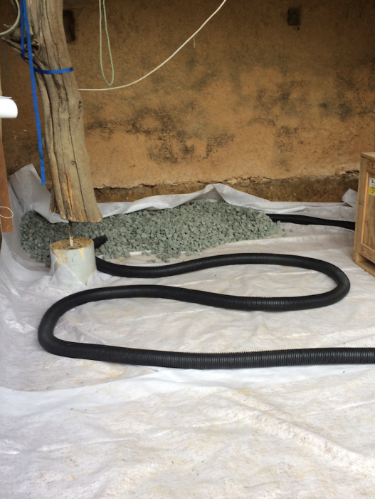 ça y est, le plus dur est fait : on a creusé sur 40cm de profondeur, on a mis en place le misapor en guise de hérisson et on va pouvoir désormais mettre les mains dans la terre, le chanvre et la paill, éteindre la chaux, etc…