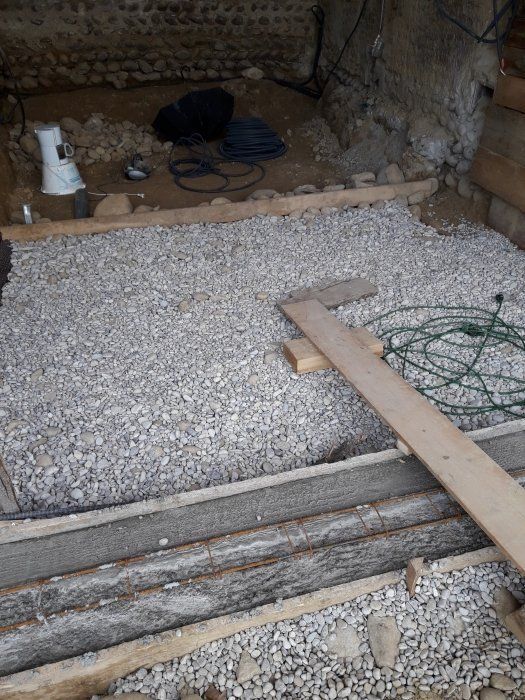 Quelques jours après le retour des beaux jours (nous l'espérons tous !!), nous allons couler notre dalle en chaux/liège en vrac, avec un maçon pro en encadrant.