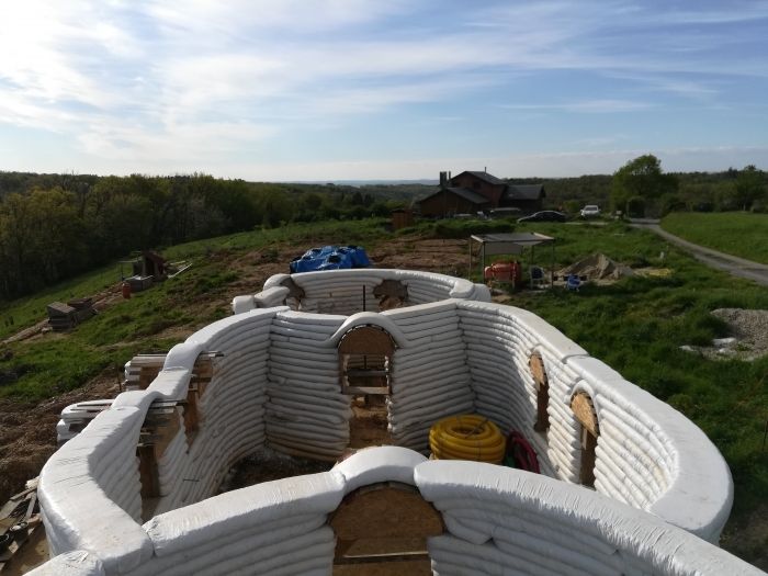 Notre projet consiste à la réalisation de deux bâtiments selon la technique du Superadobe. Grossièrement, cela consiste à remplir des tubes (gaines de polypropylène) d’un mélange de terre et sable et former ainsi des dômes en empilant les rangées de tubes les uns sur les autres. Un premier bâtiment sera notre résidence principale (de l’ordre de 110 m2) et un second nous servira de lieu d’hébergement saisonnier (location courte durée) dans le but de faire découvrir cette technique de construction. A moyen terme, nous souhaitons réaliser en plus un grand potager sur notre terrain et une partie dédiée aux animaux (chèvres, moutons, poules, etc.) pour le simple plaisir de les voir vivre “semi-librement” et s’épanouir. Dans notre imaginaire, ce serait une sorte de havre de paix !