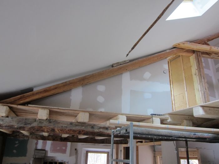 - Délignage de l’antique plancher en mélèze (décloué puis bossé et traité) puis remise en place sur les poutres de niveau