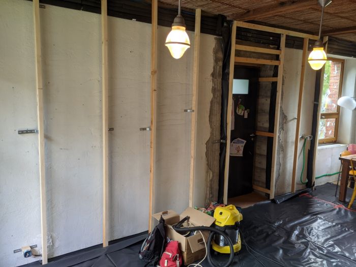 Prochaine étape : doublage intérieur des murs de la pièce de vie en chaux chanvre banché.