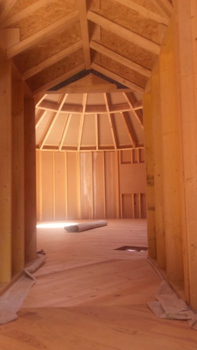 La “yourte” (maison ronde ossature bois) est double : une partie habitation, et une partie pour la salle de musique et mon piano, reliées par un sas. La yourte d' habitation est isolée en paille, et la 2ème yourte, plus petite, va être isolée en Métisse et laine de bois.