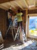 JUIN/JUILLET → Remplissage des cloisons ossature en terre/paille, en parallèle des travaux de plomberie, électricité et de pose de lambris.
