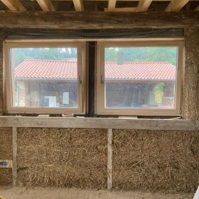 En 2024, la reconstruction de la partie d’habitation en ossature bois/paille à été réalisé et la maison à été mise hors d'eau et hors d'air!