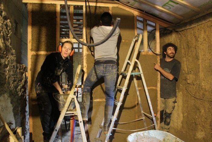 Nous travaillons sur l'ensemble du chantier, avec deux amis professionnels en éco-construction, un charpentier et Charles Guenec, spécialiste en enduit et isolation.