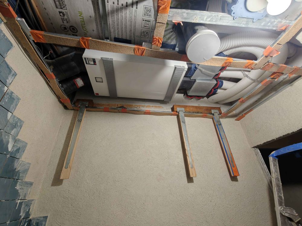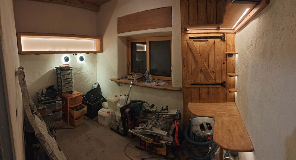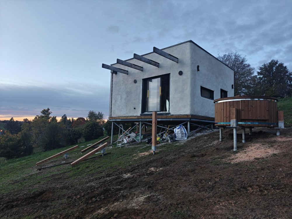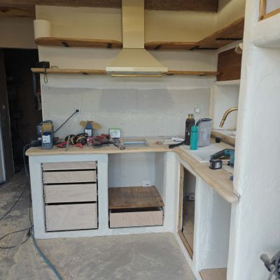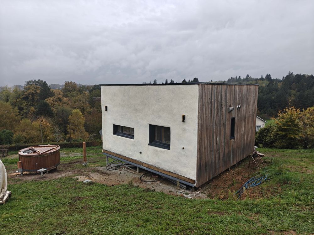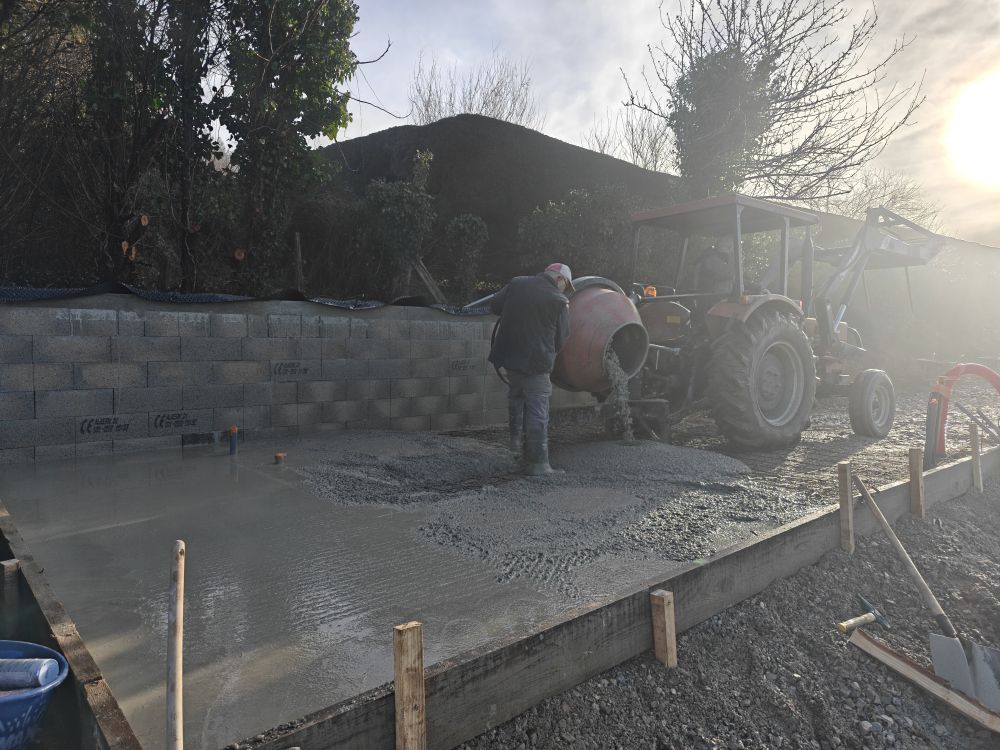 Fin mai/début juin 2022 avec la construction dans un premier temps de la partie atelier/remise adjacente à la maison. Il s’agit d’un bâtiment de 80m2.