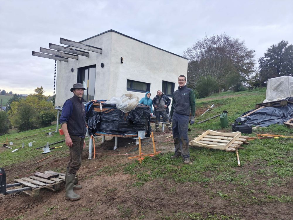 On a également un charpentier, Franck (https://terre-paille-bois.twiza.org/), qui va nous accompagner tout le long du chantier en venant aux moments les plus importants sur le terrain, en nous montrant comment faire.