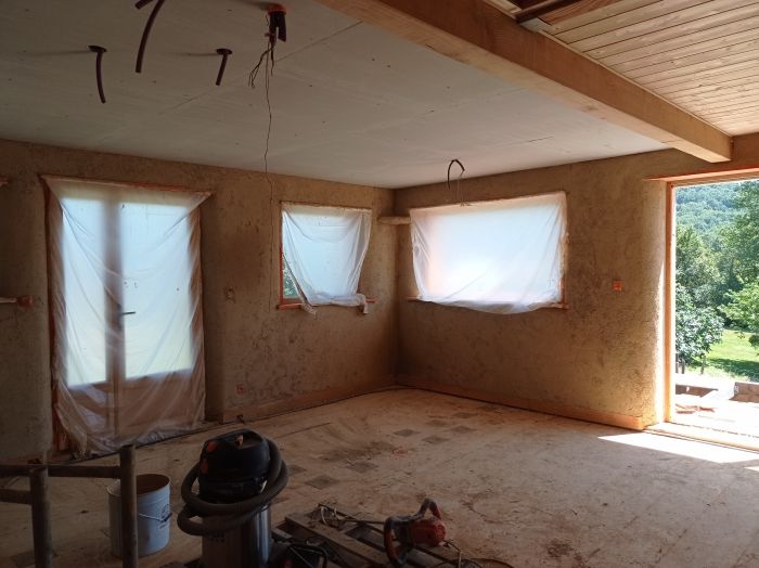 Voici maintenant 1 an que nous auto-construisons notre maison. Après une ossature bois-charpente montée avec des professionnels, des chantiers participatifs paille, torchis, bardage...les chantiers d'été nous ont permis de terminer les enduits de corps intérieur en terre-sable..