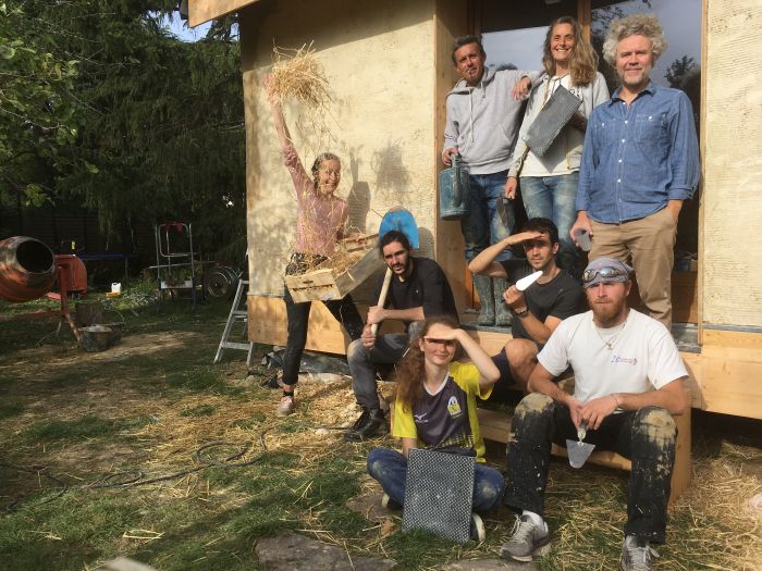 Trois chantiers participatifs ont déjà eu lieu : isolation extérieur en bottes de paille, enduit de corps extérieur en terre/chaux (2023) et enduit de finition terre/chaux/sable à l'intérieur (2024).