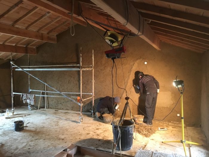 Un grand merci à tous les bénévoles et amis qui sont venus le week end dernier pour commencer les enduits de finition intérieur chaux-sable.