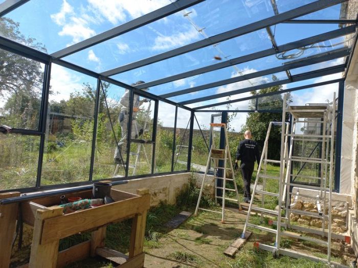 Après 6 ans de chantier sur deux bâtiments en ruine et à l'abandon depuis les années 60, nous attaquons cet été l'enduit extérieur chaux sable de la grange, les finitions d'encadrement et tableau de portes et fenêtres du logis, la serre adossée solaire passive et les aménagements extérieurs de cheminement.