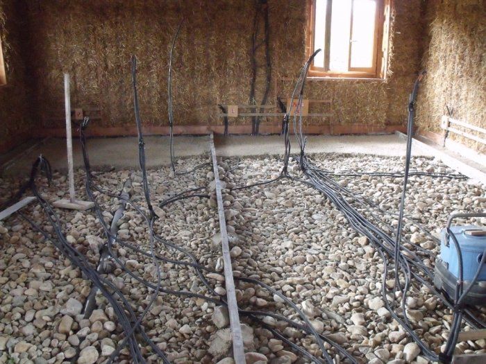 Pascal B. Passage des gaines électrique, ainsi que l'eau, et début de la chape en chaux/chanvre.