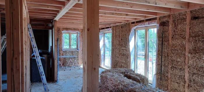 Pendant ce chantier, vous participerez à la préparation des murs en paille et à la réalisation des enduits :
