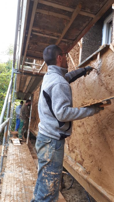 Ce chantier sera encadré par un professionnel en éco-rénovation qui prendra le temps de faire des points théoriques sur la construction paille et les enduits. Les enduits sont en terre + sable agrémenté de paille pour tenir sur le contreventement de la structure de la maison.