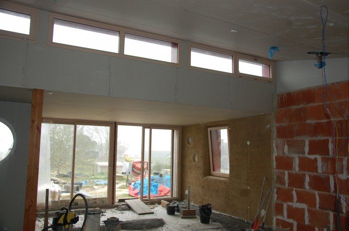 quelques photos pour avoir un aperçu un peu plus exhaustif. Il s'agit de la pièce de vie ou il y a des corps d'enduit à couvrir et des murs de masse en briques monomur remplies de sable et chaux. A venir, des photos de l'extérieur, aujourd'hui, il y a du brouillard!