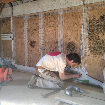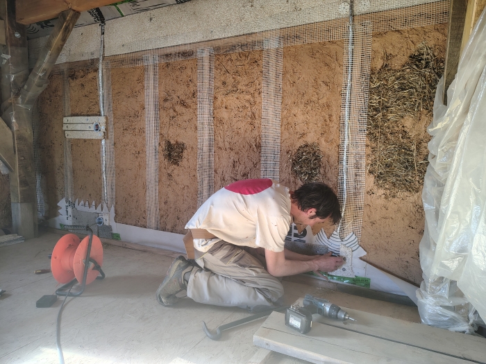 Réalisation du corps d'enduit intérieur sur les murs en paille et autres supports d'accroche (fibralith, canisse, trame fibre de verre...)