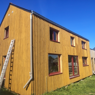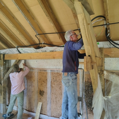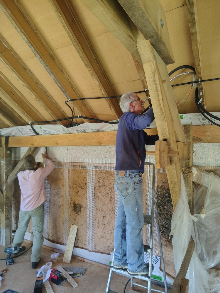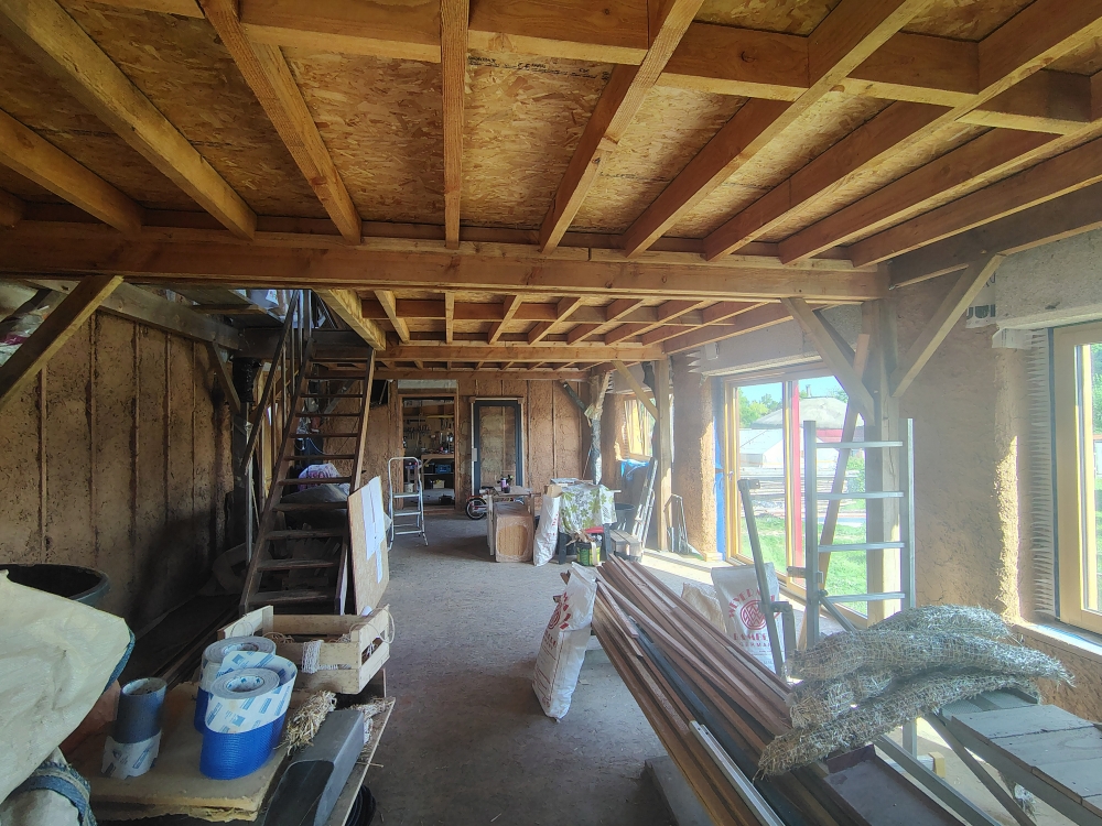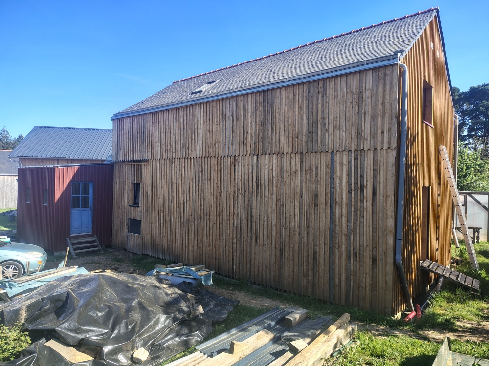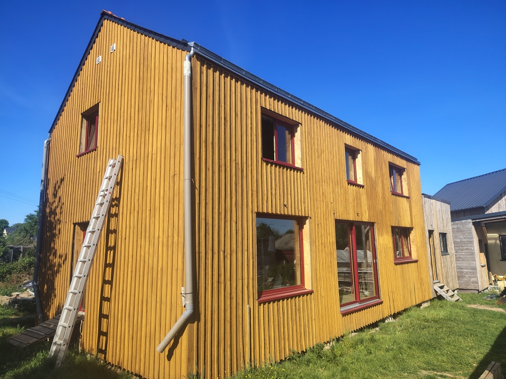 2025 : ossature secondaire, murs paille, barbotine, menuiseries extérieures, bardage et peinture suédoise.