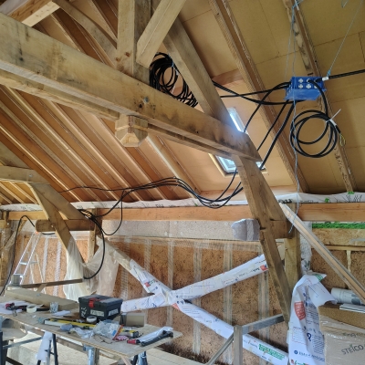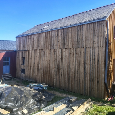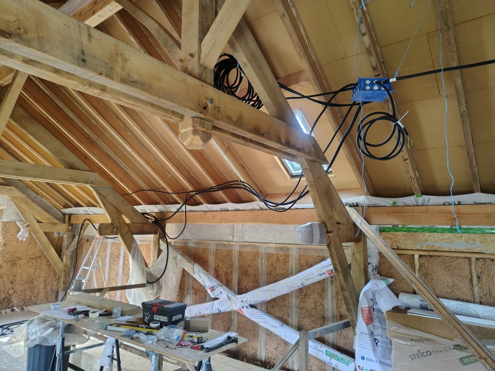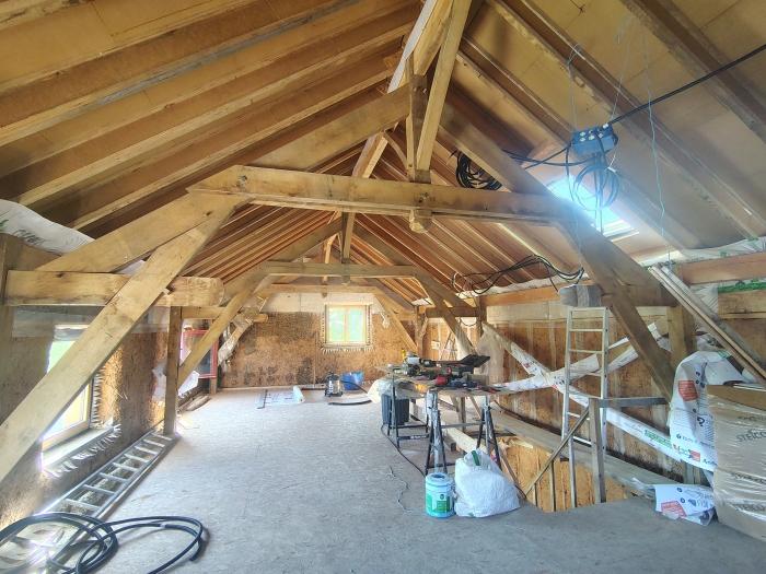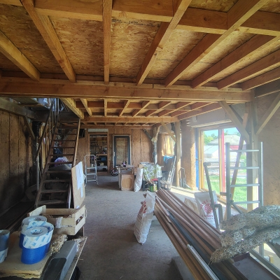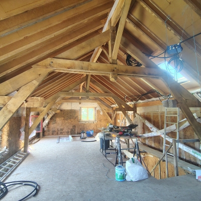 2024 : dalle bois, cellier, charpente poteaux-poutre et toiture, solivage R+1 et OSB, couverture ardoises.