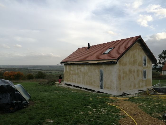 Après l'achat d'un beau terrain sur le Parc Naturel Régional des Causses du Quercy, me voilà lancé dans l'aventure de la construction depuis deux ans maintenant. J'ai opté pour une maison en ossature bois remplie de paille. Ne pouvant pas réaliser de bardage bois dans la commune, la maison sera donc entièrement enduite. L'osb est à l'intérieur, la paille à l'extérieur.