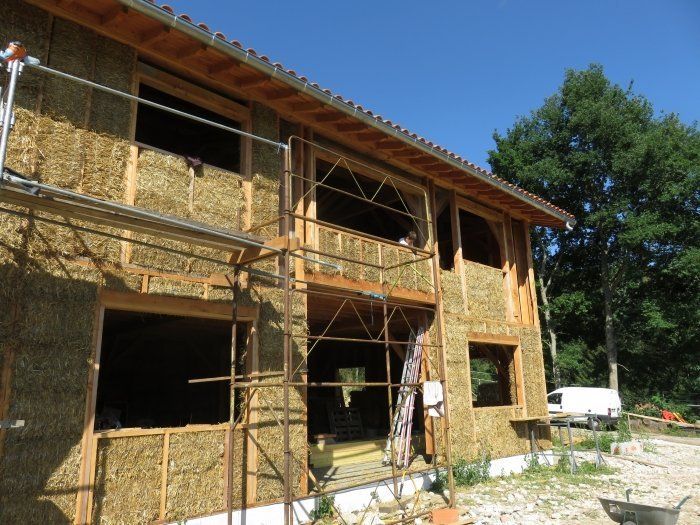 Une nouvelle étape! Après avoir rentré les 1 000 bottes de paille dans les murs au mois d'aout, nous enchainerons sur la réalisation de l'enduit chaux sur la façade sud extérieure.