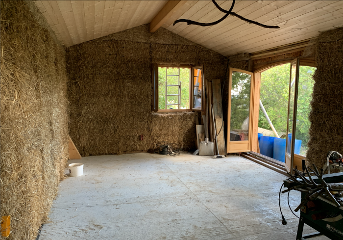 Apres la construction de notre maison en ossature bois botte de paille, paille porteuse, torchis bambou, poele de masse... nous nous lançons dans la construction de la cabane annexe à la maison. Ce qui est satisfaisant dans le cadre d'un chantier c'est que comme c'est plus petit (env 32m2)on voit les résultats plus vite.