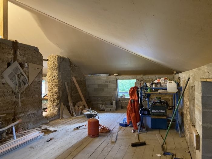 François, charpentier est à plein temps sur le chantier. Possibilité de venir 1 journée, 1 semaine, plusieurs … On vous assure des bons repas, un temps sympathique autour d’un bon coup de main ! Possibilité d’être logé en caravane sur le chantier. Nous ferons aussi des chantiers sur des gros week end ponctuellement. La toiture a été refaite, isolée en paille. Des phases de gros œuvre ont été réalisées.
