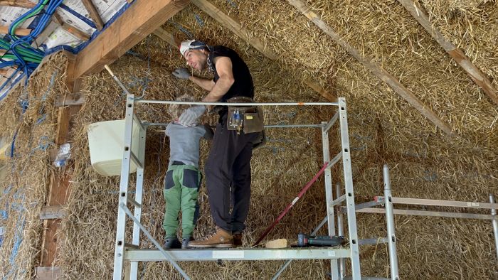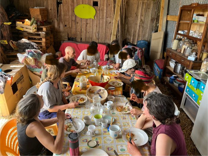 Nous avons fait 4 chantiers participatifs en 2023. En 2024, Sebastien a continué les travaux seul ou à 2. Actuellement tous les murs sont terminés et la charpente et la couverture seront finies début avril.