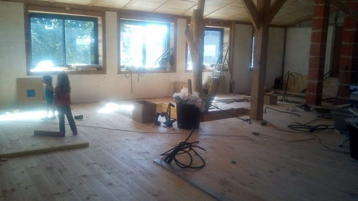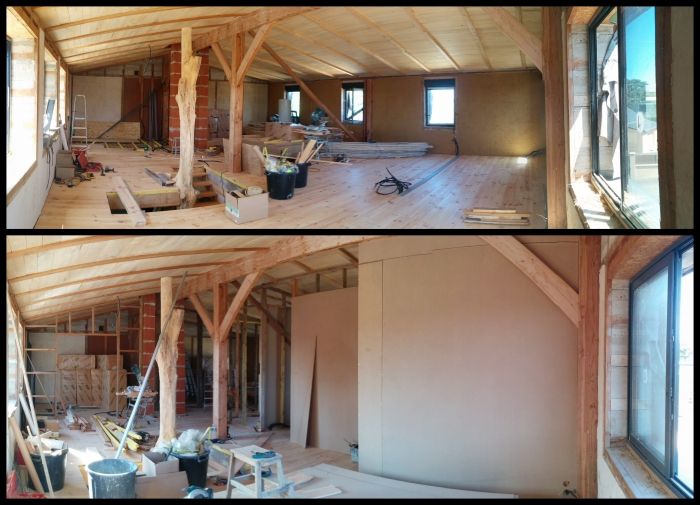 - les 3 premières semaines d'août (les 2 premières pour la pose du parquet et les cloisons de l'étage, la troisième pour les enduits terre et chaux de l'atelier de JB)