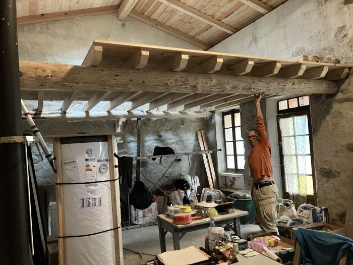 Le projet est de terminer les enduits terre de la salle bain qui sont maintenant accessibles grâce à la pose du plancher.