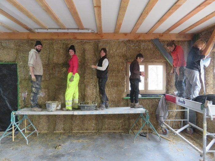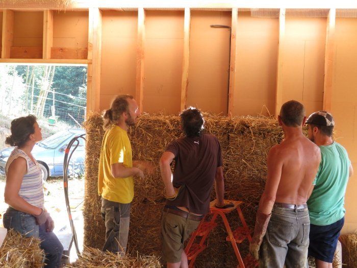 Le chantier se divisera en plusieurs ateliers: finition du mur paille (rebouchage à sec, torchi, protection bois), préparation de la matière (barbotine, enduit de corps), projection à l'aide d'une machine puis lissage.