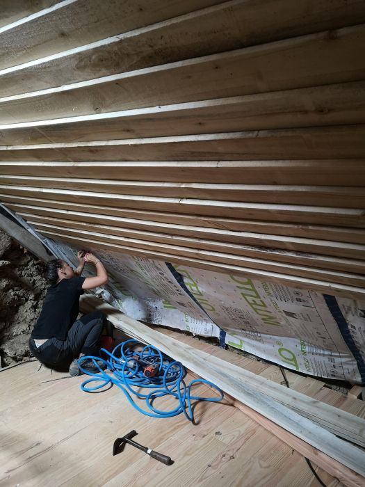 Du 19 au 26 août : Suite du premier chantier (bardage en peuplier). Puis autres pièces à aménager en salle de bain et chambre : comprend les mêmes étapes : enduits terre sur les murs, puis bardage en peuplier sur isolation déjà faite. Pose de parquet massif sur le sol. Cloisonnement intérieur à réaliser entre les 2 pièces (en OSB).