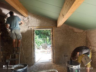 Et puis en 2022, c’est parti : l’énergie était revenue, nous avons rassemblé les moyens nécessaires, et regardé avec humilité cette bâtisse multicentenaire presque en ruine, en sachant très bien où on mettait les pieds (et les mains, l’esprit, l’âme, l’enthousiasme, la patience, la pugnacité, la résistance, la joie…). Nous avons déjà réalisé 3 chantiers participatifs, lors des étés 2022 (enrobage extérieure de l’ancienne grange en béton de chanvre), 2023 (bardage en châtaignier brut de la même grange) et 2024 (enduits intérieur chaux-chanvre-ponce dans le vieux mas), en nous appuyant sur Twiza, mais pas seulement. Ce fut efficace et essentiellement joyeux, si on gomme tous les obstacles qu’il faut franchir. Mais c’est le jeu. Comme un marathon avec une haie tous les 100m !