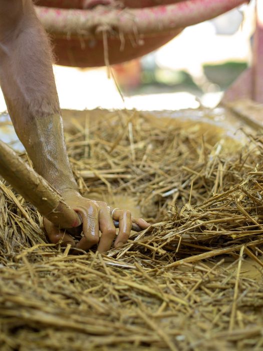 Cette étape consiste à appliquer une couche de corps de terre sur les murs intérieurs et extérieurs. Nous appliquerons à la main de la terre locale sur les murs en bottes de paille. S’il pleut, nous travaillerons à l’intérieur, et s’il fait sec, nous travaillerons sur les murs extérieurs. Nous avons besoin de l’aide de 6 à 8 personnes.