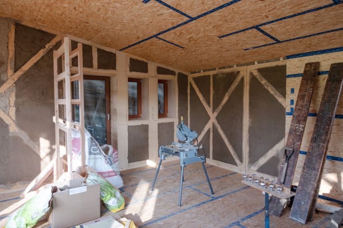 - Préfabrication des murs en paille dans une ancienne étable à proximité et application d’une première couche de terre crue (fini).