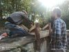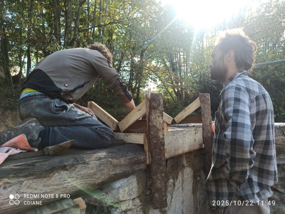 Voici les photos du chantier arase. Nous etions jusqu'à 5. Entre la mise en place du coffrage (avec les planches issues des arbres du terrain) et le coulage du béton de chaux, celà à pris deux jours.