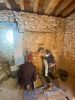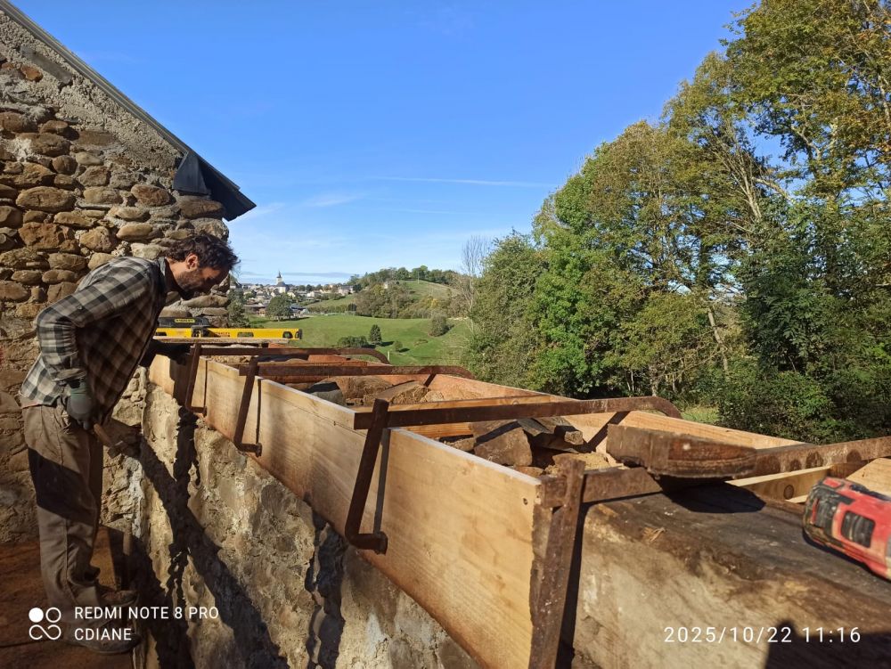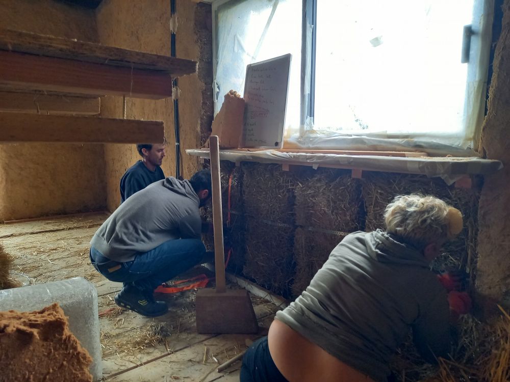 Et grâce à la motivation des bénévoles et de nos stagiaires, lors cette semaine de pluie, le chantier participatif à repris plein d'entrain pour faire les enduits de corps dans le salon... et faire du jointoiement à la chaux du vieux mur pierre de la chambre.