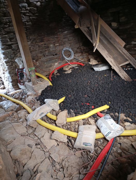 - un hérisson drainant en pouzzolane,...Afficher la suite Il nous faut gérer l'humidité dans notre maison construite en pierres seches directement sur terre battue (et à flanc de roche mère). Pour cela, nous sommes en train de faire :