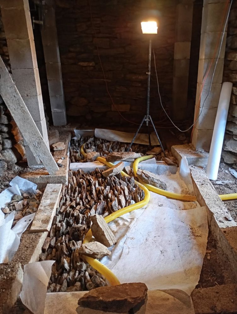 Il nous faut gérer l'humidité dans notre maison construite en pierres seches directement sur terre battue (et à flanc de roche mère). Pour cela, nous sommes en train de faire :