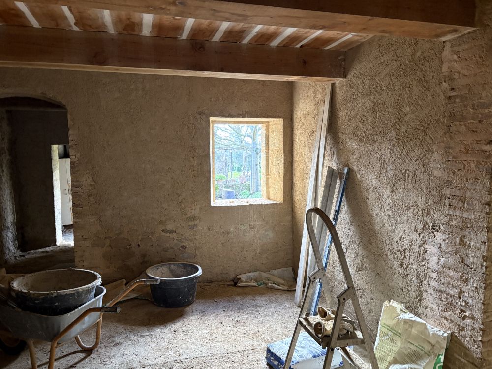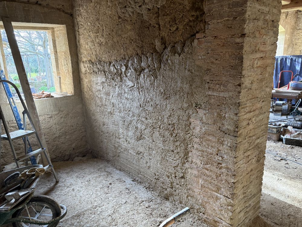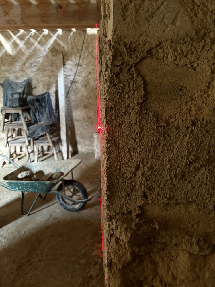 Niveau laser en mode ligne rouge, dégrossis au mortier chaux, sable et pierre ponce (pour les bas de murs humides)...Afficher la suite Cet hiver, pendant que la pluie fait du zèle dehors, le chantier lui, se passe au laser dedans!